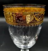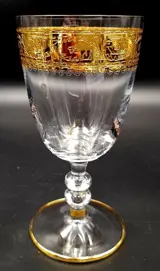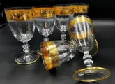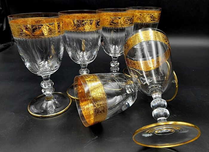 Set van 6 wijnglazen. Afmetingen: hoogte 16,4 cm - diameter 8,1 cm in geslepen kristal, mondgeblazen vintage van Cre Art Srl Aurea decoratie, opgericht in 1968, gelegen in de provincie Florence daterend uit de tweede helft van de 20e eeuw. Een van de beste Toscaanse producenten. Zeer zeldzaam en zeer gewild. Allemaal handgemaakt en afgewerkt in 24 karaats goud in de bovenrand en in de voet, dubbele bol in de steel. Een uit duizenden. Dit item is met de hand gedecoreerd door meestervaklieden met 100% hooggebakken goud.