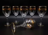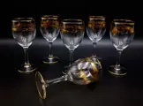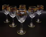 Schitterende set van 6 wijnbekers in met de hand gepolijst en met de hand gesneden kristal met brede band en guirlandes van bloemen in puur goud gebeiteld met diamanten punt en met de hand beschilderd in puur goud, met handtekening onder elk enkel glas. Het bedrijf werd opgericht in het jaar 1825 met het hoofdkantoor in Arques, Frankrijk Arc Holdings beroemd in de wereld. Stopgezet en zeer gewild.
