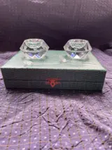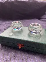 2 kristallen zoutvaatjes met de twee lepels en bijbehorende doos