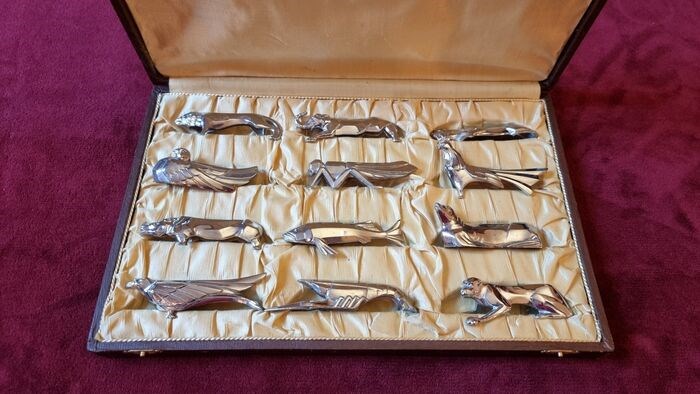 Set van 12 verzilverde meshouders in art-decostijl in hun originele doos.