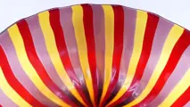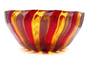 Grote slakom van Muranoglas met strepen in de kleuren rood, geel en paars.
