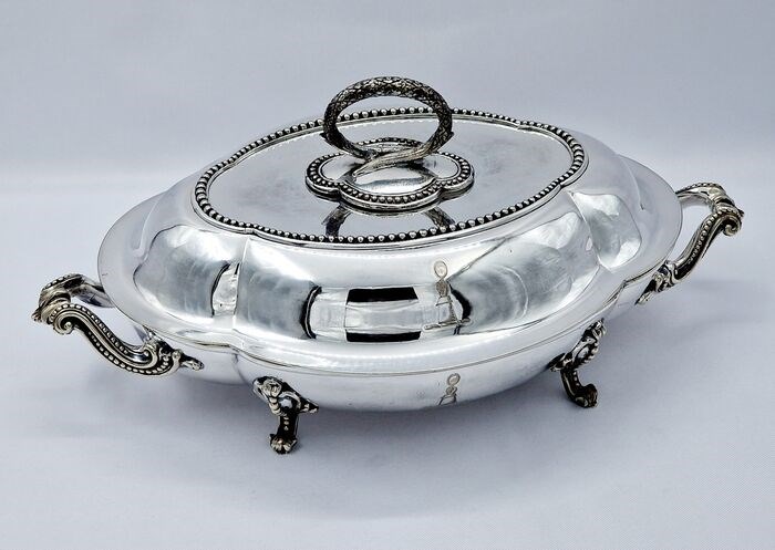 Een prachtige zeldzame gedecoreerde verzilverde voorgerecht/serveerschaal met deksel, gemaakt door de beroemde Elkington & Co. in Birmingham, Engeland in 1867 (volgens de datumlettermarkering "E into a square").