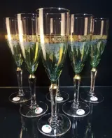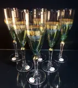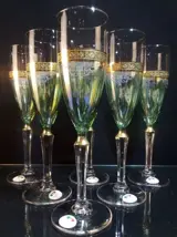 6 champagneglazen in 14% artistiek pastelgroen kristal, met een elegante gravure en afgewerkt in puur goud.