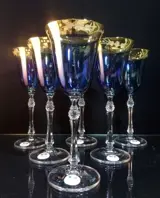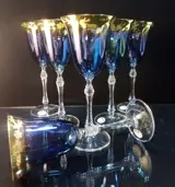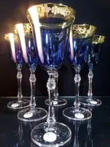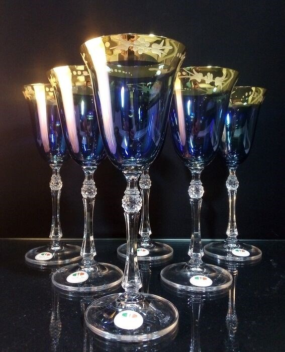 Drinkbekers in kostbaar korenbloemblauw kristal, afgewerkt in puur goud, gedecoreerd in freehand slijpen, met diamanten motief op de steel, Gemaakt met dubbel bakken bij hoge temperaturen.