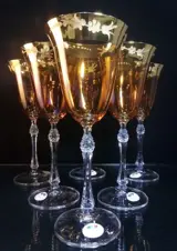 Drinkbekers in kostbaar okergeel kristal, afgewerkt in puur goud, gedecoreerd in freehand slijpen, met edelsteen op de steel met een diamantmotief, Gemaakt met dubbel bakken bij hoge temperaturen.