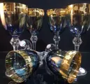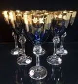 Bluette kristallen wijnbekers met avion-reflecties, afgewerkt in puur goud, gedecoreerd in freehand slijpen door een gerenommeerde vakman. Gemaakt met dubbel koken bij hoge temperaturen.