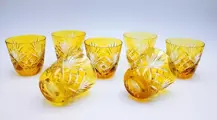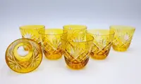 Maison Tatiana, 7 amberkleurige waterglazen in geslepen, gebeiteld, mondgeblazen Vintage kristal van het bekende Fabergé maison, model; Keizerlijke collectie Xenia.