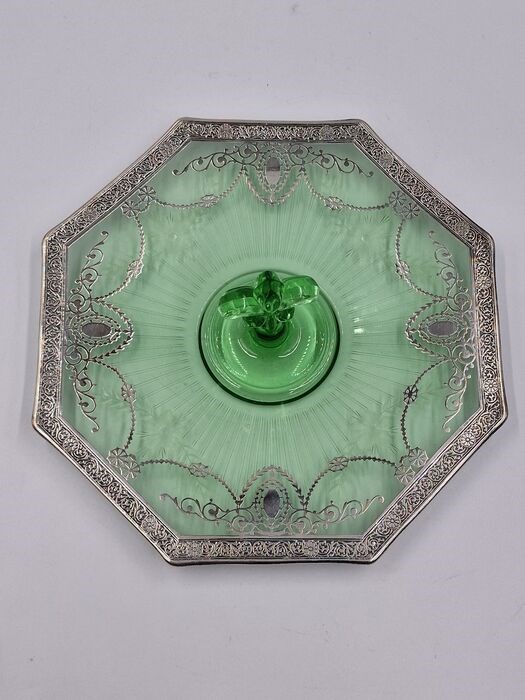 Groen glazen (uranium glas) centerpiece met als handvat een Franse lelie. De onderkant van de schaal heeft een geëtst decor.