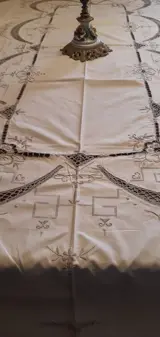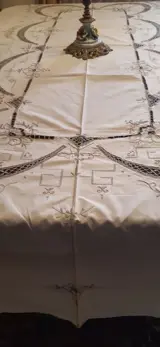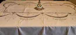 Schitterend, groot tafelkleed volledig geborduurd met houtsnijwerk en gehaakte inzetstukken, nauwgezet met de hand gemaakt door deskundige vakmensen in het veld.