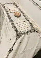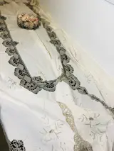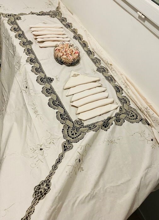 Vintage katoenen tafelkleed geborduurd in textuur- en bloemmotieven, de 12 prachtige servetten zijn bij dit tafelkleed inbegrepen.