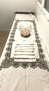 Afmetingen: 260x160. Het tafelkleed is in goede staat, maar de servetten hebben wat sporen van vintage vergeling - ik weet niet of het te maken heeft met het gebruik of misschien met de opslagsporen - omdat ze jarenlang ongebruikt in de toilettas hebben gestaan.