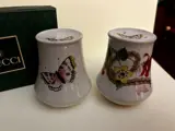 Prachtig paar fijn gedecoreerde porseleinen peper- en zoutvaatjes gesigneerd door Gucci.