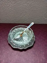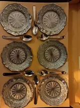 De onderborden en lepeltjes zijn van inox, de schaaltjes vermoedelijk kristal en glas.
