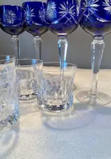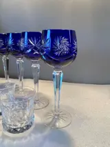 Nobele koningsblauwe Duitse handgemaakte kristallen bokaal en vijf handgeslepen patroon whiskyglazen, prachtige collectie, gemaakt in Duitsland.
