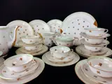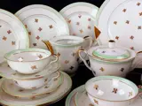 Rapporteren; ontbrekend theepotdeksel, twee microscopische chips op twee kopjes in een kleine chip op de bodem van de cakevorm niet erg zichtbaar. Verder in zeer goede staat met normale ouderdoms-, gebruikssporen. Zie staat op detailfoto's.