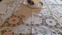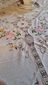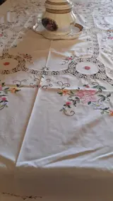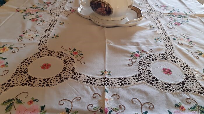 Heerlijk tafelkleed, geheel met de hand geborduurd, in kruissteek.