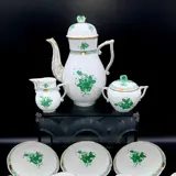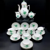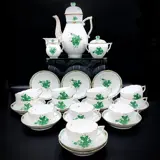Schitterend Theeservies voor 12 personen, bestaande uit grote koffiepot met rozendeksel, suikerpot eveneens met rozendeksel en melkkan, samen met 12 kopjes en 12 schotels, geproduceerd door Herend - Collectie "Chinese Bouquet", Apponyi Green, in excellent tot puntgaaf voorwaarde.