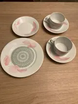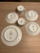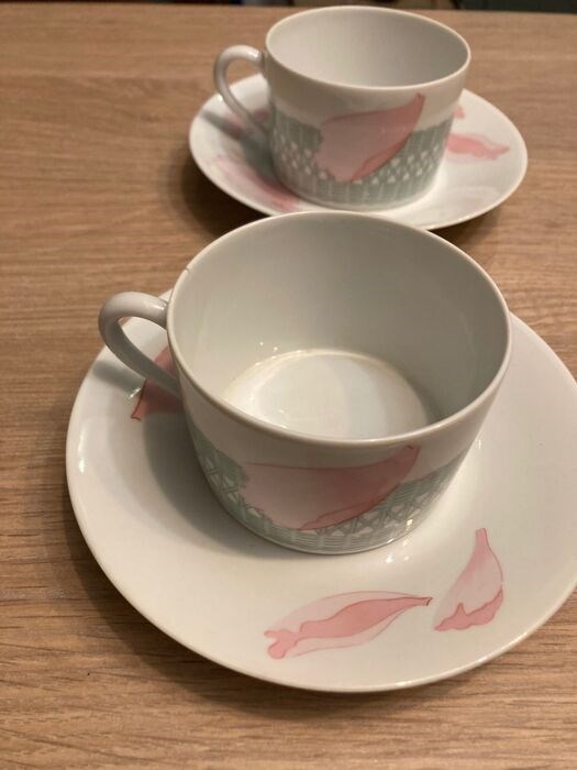 Hermès koffie- of ontbijtservies voor twee personen, porselein uit Limoges. Uittreksel uit de verzameling Hermès-pleinen. Originele kleur made in France - pioenrozen model met twee koffiekopjes, drie schotels en een broodbord waar gebakjes in zitten plus twee kleine stofzak-achtige zakjes. van ontbrekend porselein zie foto. De rest is in uitstekende staat.
