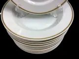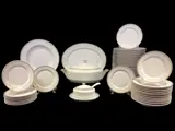 Servies voor 12 personen met dubbele gang, van de in 1814 opgerichte historische Duitse porseleinfabriek Hutschenreuther. Het servies is gemaakt van wit en fijn porselein, de elementen zijn allemaal in goud vermeld.