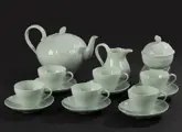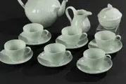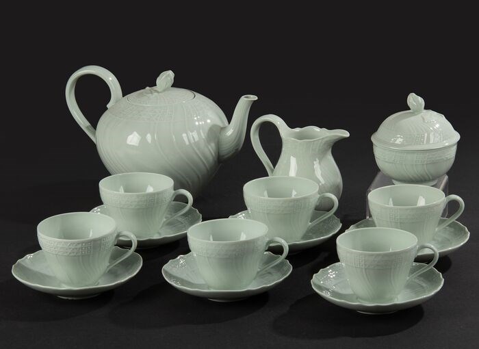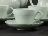 Mooi porseleinen theeservies voor zes personen van het Duitse merk Hutschenreuther. Het servies is grijs/wit van kleur, mooi gedecoreerd met reliëf motieven. De naam van het model is Seladon. De samenstelling van de set is als volgt: