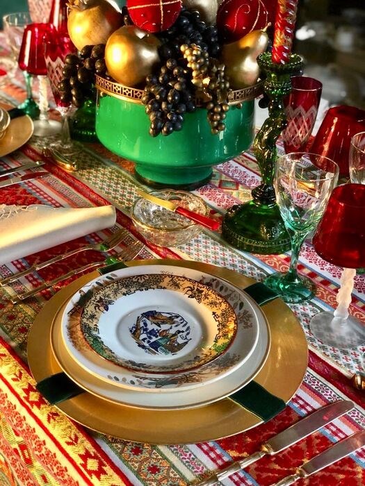 Indrukwekkend etnisch brokaat tafelkleed, met intense kleuren en gouddraad strepen voor grote tafels. Het is een natuurlijke stof, met een sterke textuur en zonder mengsel, die door zijn weefwijze een eerbetoon is aan de stoffen die door bandieten in de bergen worden gebruikt, vanwege zijn grote weerstand en veelzijdigheid.