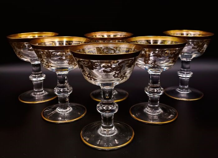 Italiaans fabrikaat, set van 6 luxe en zware champagneglazen in geslepen, gebeiteld, mondgeblazen kristal. Zeer zeldzaam en zeer gewild. Allemaal handgemaakt en afgewerkt in 24 karaats goud. Festoendecoratie, zware bokaal en van een buitengewone fabricage, let op de verwerking van de steel, uniek in zijn soort. Dit artikel is door meester-ambachtslieden volgens de school van Murano gedecoreerd met 100% hooggebakken goud. De kleine gebreken die u kunt vinden, garanderen dat het product volledig handgemaakt is en waardevol is als een kunstwerk. Elegante en tijdloze vormgeving.
