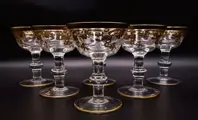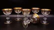Italiaans fabrikaat, set van 6 luxe en zware champagneglazen in geslepen, gebeiteld, mondgeblazen kristal. Zeer zeldzaam en zeer gewild. Allemaal handgemaakt en afgewerkt in 24 karaats goud. Festoendecoratie, zware bokaal en van een buitengewone fabricage, let op de verwerking van de steel, uniek in zijn soort. Dit artikel is door meester-ambachtslieden volgens de school van Murano gedecoreerd met 100% hooggebakken goud. De kleine gebreken die u kunt vinden, garanderen dat het product volledig handgemaakt is en waardevol is als een kunstwerk. Elegante en tijdloze vormgeving.