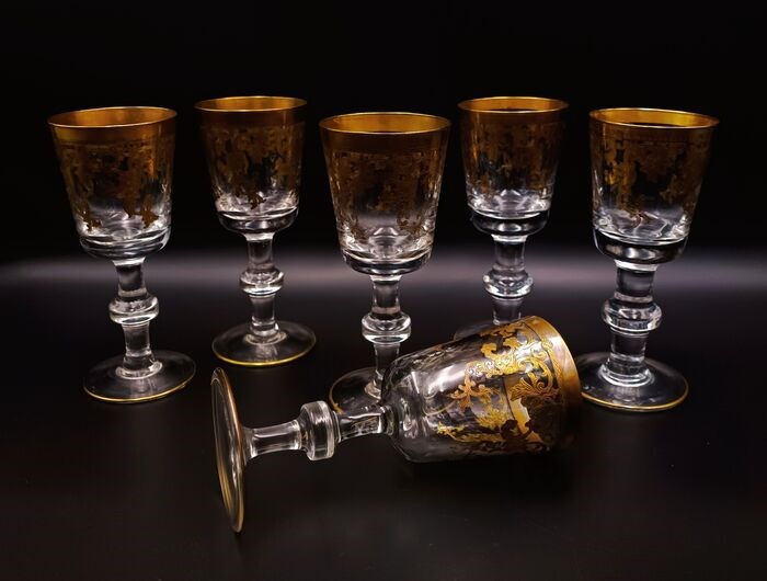 Italiaanse fabricage, set van 6 luxe en zware rode wijnbekers in geslepen, gebeiteld, mondgeblazen kristal. Zeer zeldzaam en zeer gewild. Allemaal handgemaakt en afgewerkt in 24 karaats goud. Festoendecoratie, zware bokaal en van een buitengewone fabricage, let op de verwerking van de steel, uniek in zijn soort. Dit artikel is door meester-ambachtslieden volgens de school van Murano gedecoreerd met 100% hooggebakken goud. De kleine gebreken die u kunt vinden, garanderen dat het product volledig handgemaakt is en waardevol is als een kunstwerk. Elegante en tijdloze vormgeving.
