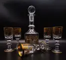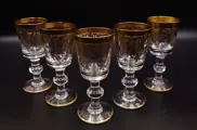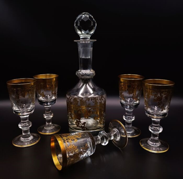 Italiaans fabrikaat, set van 5 luxe en zware witte wijnbekers met fles in geslepen, gebeiteld, mondgeblazen kristal. Zeer zeldzaam en zeer gewild. Allemaal handgemaakt en afgewerkt in 24 karaats goud. Festoenversiering, zware bokaal en van een buitengewone fabricage, let op de verwerking van de steel, uniek in zijn soort. Dit item is gedecoreerd door meester-ambachtslieden volgens de Murano-school met 100% hooggebakken goud. De kleine gebreken die u kunt vinden, garanderen dat het product volledig handgemaakt is en waarde heeft als een kunstwerk. Elegante en tijdloze vormgeving.