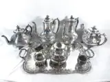 1 dienblad 44 cm lang, 4 kannen 24 en 18 cm hoog, een suikerpot, een creamer en een melkkan.