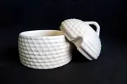 Verfijnd reliëf ribbel-decor en fraai creme-wit glazuur. Ontwerper: John Goodwin