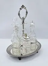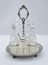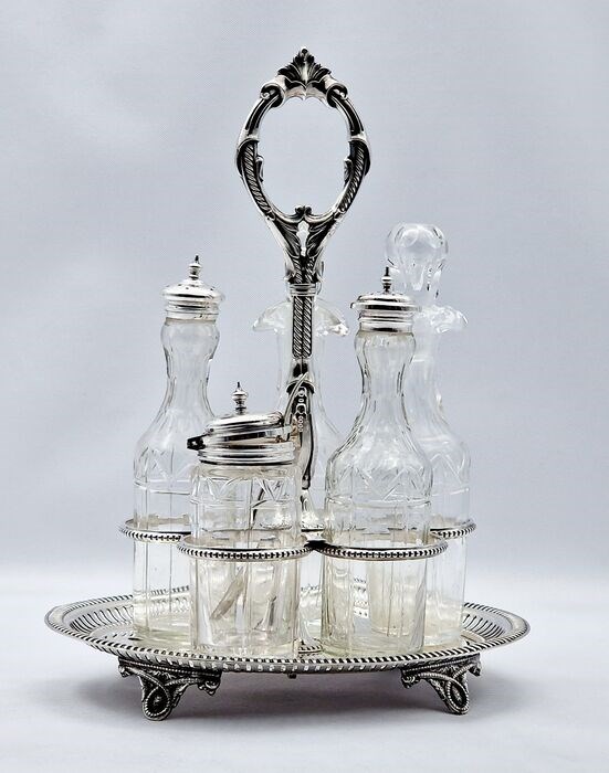 Een zeer mooie Oil & Vinnegar/Condiment Cruet verzilverd met 5 kristallen geslepen flesjes, gemaakt door John Nodder & Sons, Sheffield, tussen 1863-1897.