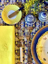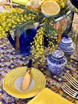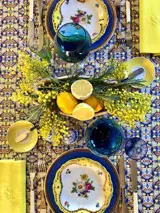 Katoenen canvas bedrukt tafelkleed, blauwe en gele tinten, met kleine citroenen. Een klassiek tafelkleed, vrolijk en makkelijk te combineren met elk servies.