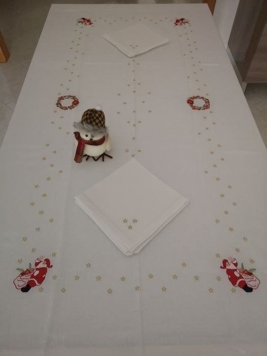 Rijk kerst tafelkleed x 12 (inclusief 12 100% linnen servetten) in 100% puur linnen met volledig Punto borduurwerk geheel met de hand.