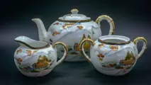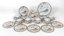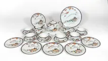 Schitterend theeservies van fijn en kostbaar porselein voor 6 personen met een oosters Japans thema gedecoreerd met motieven uit de natuur en complementaire geometrische elementen en gouden details. Set in uitstekende staat met minimale gebruikssporen. Om de details aan de onderkant van de beker compleet te maken in reliëf een vrouw met Aziatische trekken in typisch Japanse kleding. Het kavel wordt gecompleteerd met een hoofdblad met 6 dessertborden, 6 kopjes met onderzetters, theepot, suikerpot en melkkan. Alle items zijn vrij van afdrukken of markeringen van erkenning of herkomst.