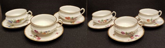 kenmerkend voor de "rocaille"-vorm zijn de schelpvormige ornamenten, kostbaar versierd met gekleurde bloemen en insecten; elegante gouden rand.