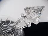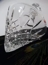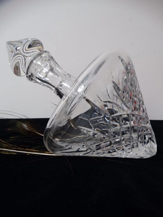 Zeer mooie zware kristallen decanter, een ontwerp die horizontal op tafel ligt, Een genot om naar te kijken en uit te schenken, heeft een prachtig strak slijpsel, zie foto’s. Heeft een recht vlak, waar door de karaf stabiel blijft liggen. Inhoud 1 liter, De hoogte is 33 cm. De diameter is 19 cm —— wordt traceerbaar verzonden.