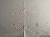 Museumwaardig laken van puur perkalkatoen, met de hand geborduurd in opengewerkt en satijnsteek