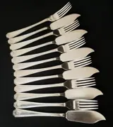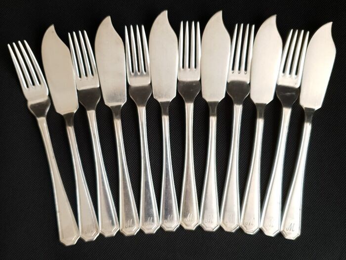 12-delige viseterset, zwaar verzilverd bestek, patroonklemmen, motiefletter m, minimaal gebruik, uitstekende kwaliteit en staat.