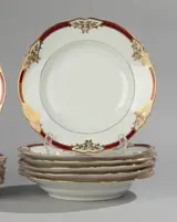 Het servies is gedecoreerd met rode randen en fraaie goudkleurige accenten. De samenstelling van de set is als volgt: