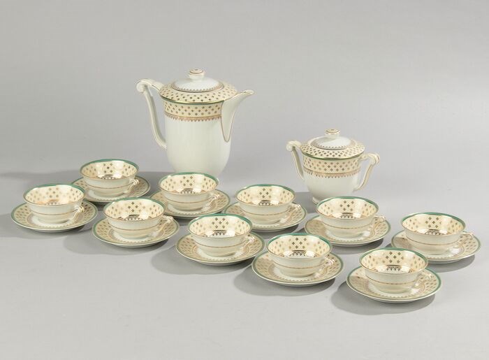 Prachtig porseleinen theeservies voor 10 personen van het Franse merk Raynaud Limoges. Het servies is gedecoreerd met ivoorkleurige brede randen, een smal groen randje en goudkleurige accenten. De samenstelling van de set is als volgt: