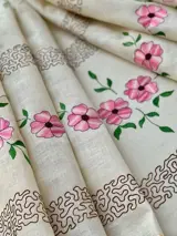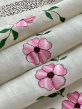 Fijn linnen tafelkleed, zonder enige vorm van vermenging, met vijf bijpassende servetten, en een zeer delicaat handborduurwerk van bloemen in intense kleuren. De textuur van de stof is geweldig voor zijn herfst.