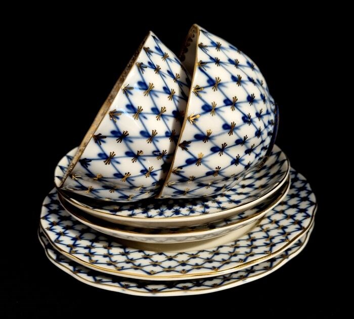 2 x koffieservies 3-delig cobalt net 22 karaats goud.