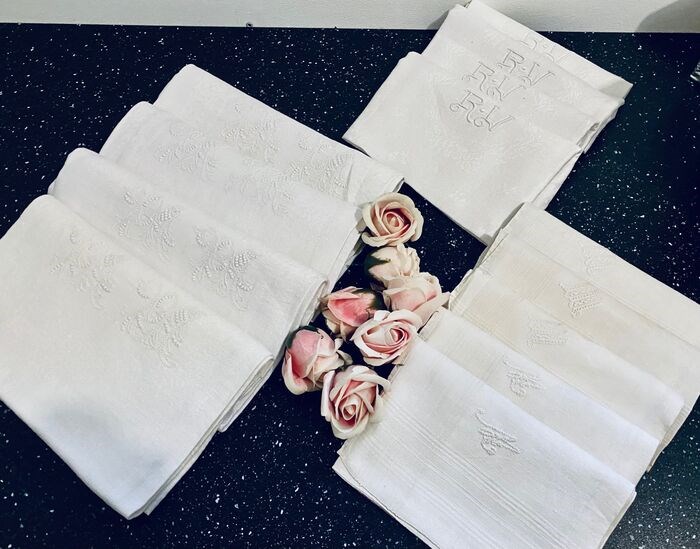 Oude katoenen en linnen damasten servetten, met geweven structuur en dessins.Het oude monogram geborduurd in het midden, absolute kwaliteit. uiterst zeldzaam lot in alle 35 stuks. Het ontwerp komt niet overeen met 5,4 of 2 identieke handdoeken. De verschillende met de hand geborduurde initialen voor de vroege XX trouwpakketten. sober en elegant en past bij alles.Kijk goed naar mijn foto's en mijn beschrijving, ik nodig u uit om de afbeeldingen te vergroten om de details te zien die prachtig zijn.