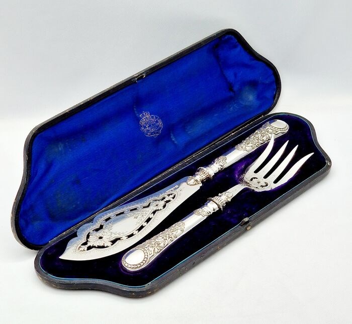 Een prachtige Victoriaanse verzilverde visbestekset, gemaakt door Martin Hall & Co. (Richard Martin & Ebenezer Hall), omstreeks 1860-1866, volgens keurmerken.