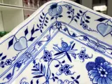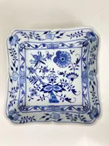 Een mooie vierkante serveerschaal met het beroemde Blue Onion Decor. Gesigneerd "Decor-Meissen". Geproduceerd ergens tussen de jaren 20-50.