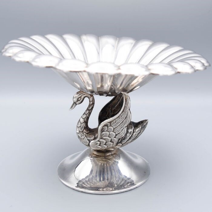 Oud gestanst nikkelzilver centrum dat steunt op de vleugels en kop van een zwaan.