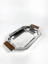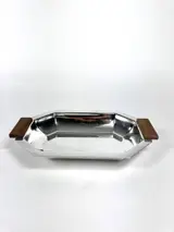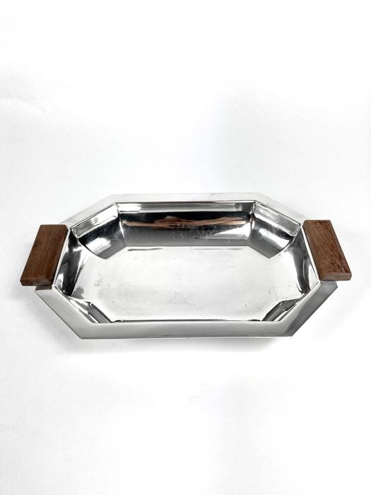 Prachtige Art-Deco broodschaal van de Brusselse zilversmid Albert Charlent. Waarschijnlijk doch verzilverd in plaats van massief zilver (Charlent maakte vooral zilver). Afgewerkt met houten handvaten. Zeer degelijk gemaakt. Gemerkt onderaan met het meesterteken van Albert Charlent.