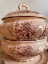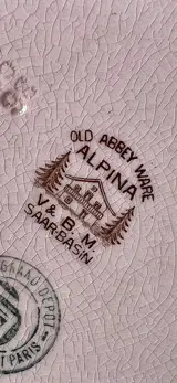 Antiek Oud Abdijgoed ALPINA, V&B.M. Saars Basin, Villeroy Boch Duitsland, Bourdeaux servies op een roze achtergrond XIX