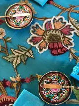 Natuurlijk zijde organza tafelkleed, zonder enige vorm van menging, een stof van uitzonderlijke kwaliteit, waarop exotische takken en bloemen met de hand zijn geborduurd in winterse kleuren.